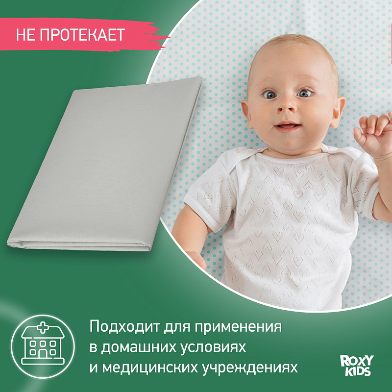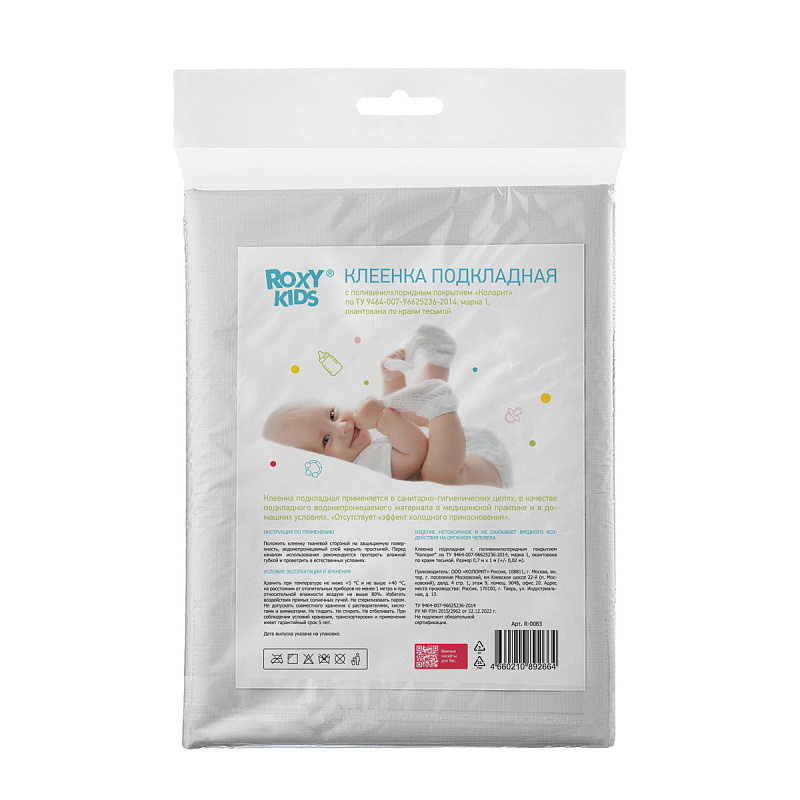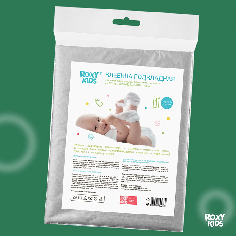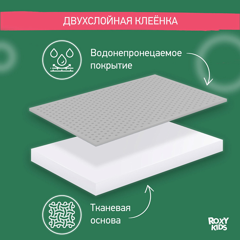 Подкладная клеенка с резинками-держателями защищает матрасы и любую другую поверхность от загрязнения или протекания жидкостей. Удобно крепится к детским матрасам с помощью резинок-держателей. Изделия ROXY-KIDS производятся из специальной медицинской клеенки с ПВХ-покрытием. Все клеенки имеют окантовку по периметру. Они обладают отличной теплопроводностью. Специальный покрывающий слой на основе поливинилхлорида делает поверхность пеленок удобной и комфортной - она быстро приобретает температуру человеческого тела. Отсутствует эффект холодного прикосновения, что очень важно в педиатрии. Микропористая структура данного покрытия придает клеенке свойства газопроницаемости.