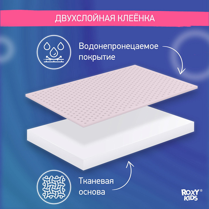 Подкладная клеенка с резинками-держателями защищает матрасы и любую другую поверхность от загрязнения или протекания жидкостей. Удобно крепится к детским матрасам с помощью резинок-держателей. Изделия ROXY-KIDS производятся из специальной медицинской клеенки с ПВХ-покрытием. Все клеенки имеют окантовку по периметру. Они обладают отличной теплопроводностью. Специальный покрывающий слой на основе поливинилхлорида делает поверхность пеленок удобной и комфортной - она быстро приобретает температуру человеческого тела. Отсутствует эффект холодного прикосновения, что очень важно в педиатрии. Микропористая структура данного покрытия придает клеенке свойства газопроницаемости.
