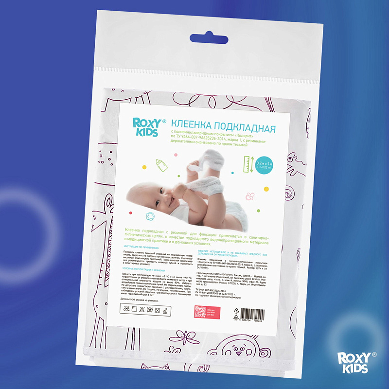Подкладная клеенка с резинками-держателями защищает матрасы и любую другую поверхность от загрязнения или протекания жидкостей. Удобно крепится к детским матрасам с помощью резинок-держателей. Изделия ROXY-KIDS производятся из специальной медицинской клеенки с ПВХ-покрытием. Все клеенки имеют окантовку по периметру. Они обладают отличной теплопроводностью. Специальный покрывающий слой на основе поливинилхлорида делает поверхность пеленок удобной и комфортной - она быстро приобретает температуру человеческого тела. Отсутствует эффект холодного прикосновения, что очень важно в педиатрии. Микропористая структура данного покрытия придает клеенке свойства газопроницаемости.