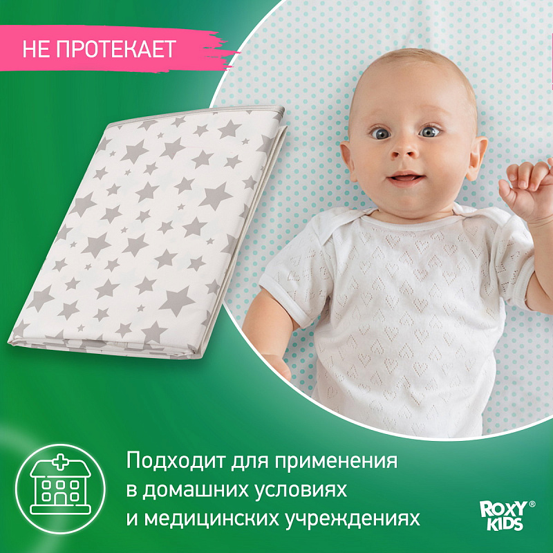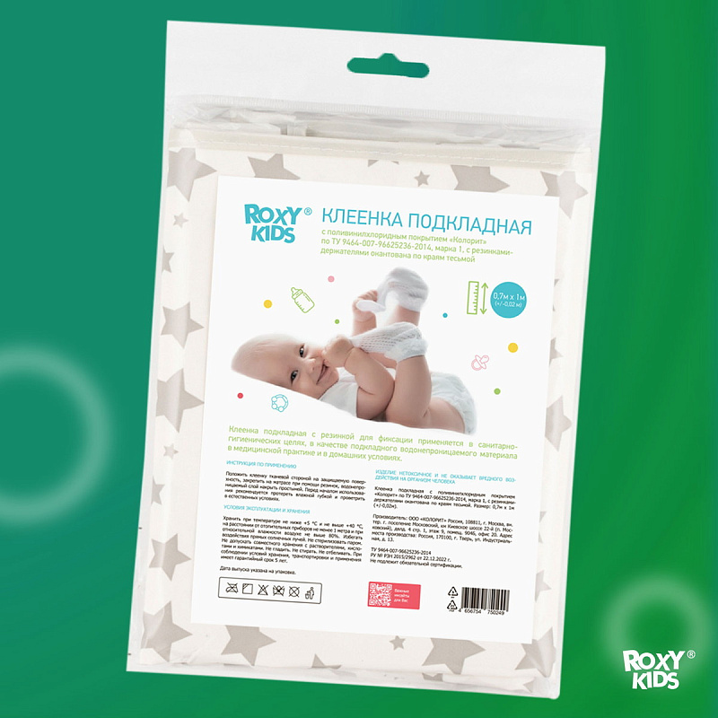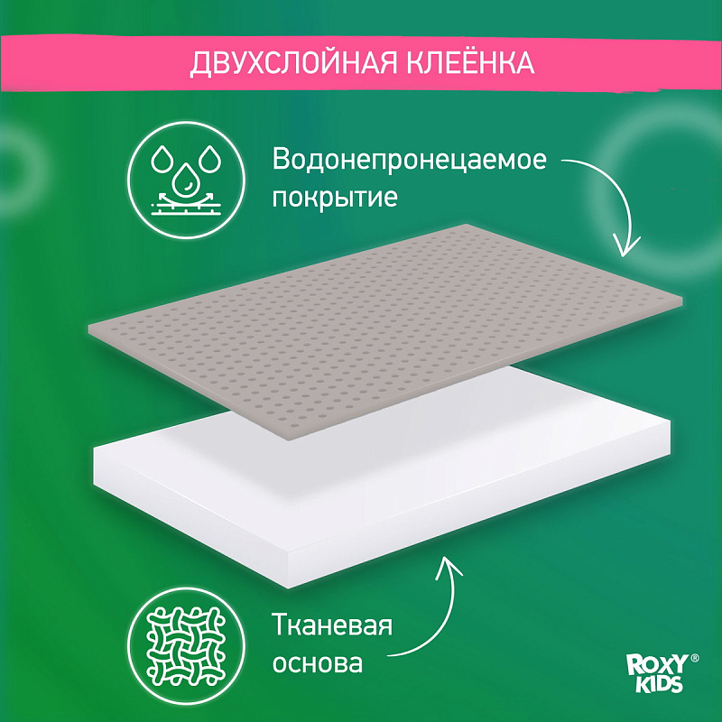 Покладная клеенка с резинками-держателями защищает матрасы и любую другую поверхность от загрязнения или протекания жидкостей. Удобно крепится к детским матрасам с помощью резинок-держателей. Изделия ROXY-KIDS производятся из специальной медицинской клеенки с ПВХ-покрытием. Все клеенки имеют окантовку по периметру. Они обладают отличной теплопроводностью. Специальный покрывающий слой на основе поливинилхлорида делает поверхность пеленок удобной и комфортной - она быстро приобретает температуру человеческого тела. Отсутствует эффект холодного прикосновения, что очень важно в педиатрии. Микропористая структура данного покрытия придает клеенке свойства газопроницаемости.