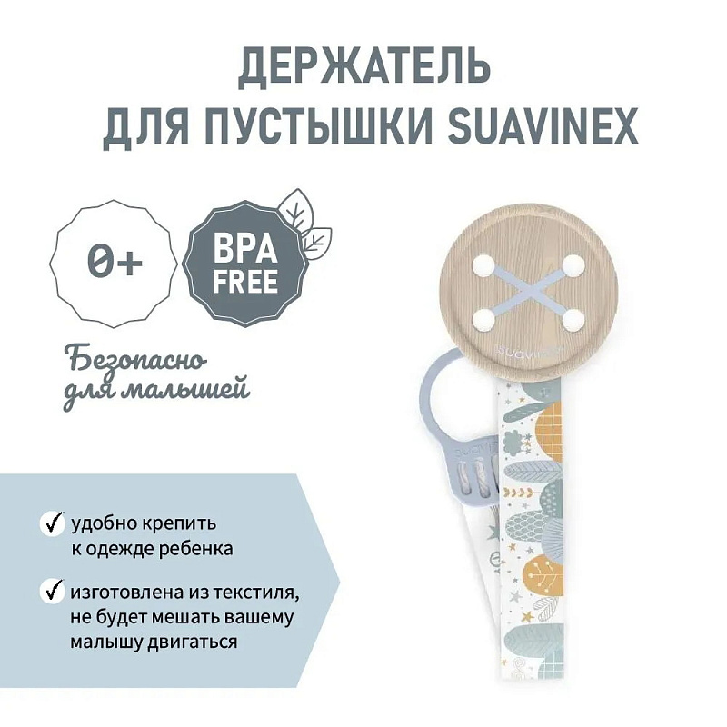 Клипса для пустышки Suavinex — незаменимый аксессуар на прогулках и во время игр: с помощью прищепки клипса крепится к одежде малыша, сумке или коляске, а значит пустышка не упадет на землю и не потеряется.