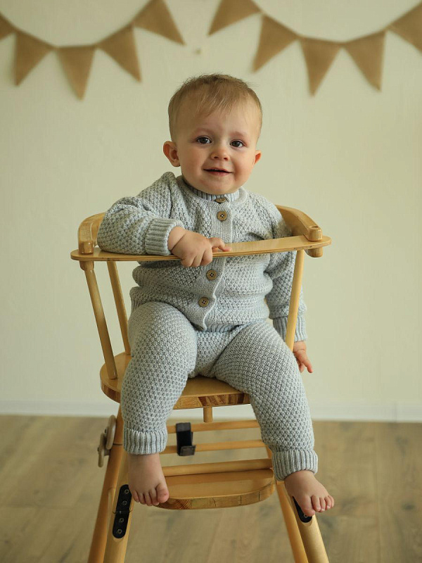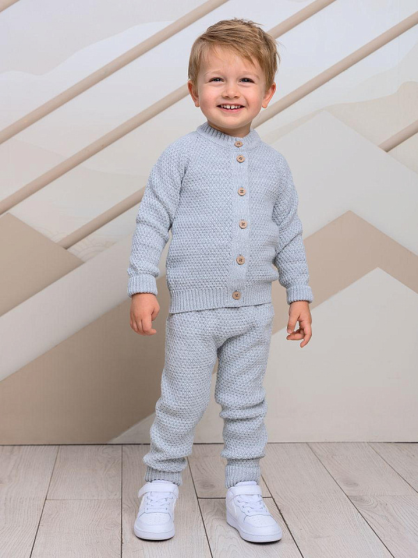Элегантный комплект из кофточки и штанов для маленьких принцев. Изысканный серый меланж и натуральные материалы делают этот комплект идеальным выбором для повседневной носки.