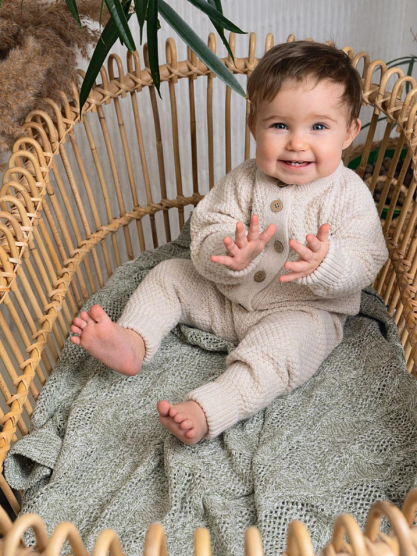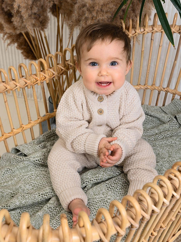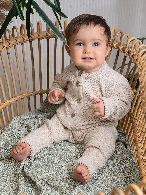 Элегантный комплект из кофточки и штанов для маленьких принцев. Изысканный серый меланж и натуральные материалы делают этот комплект идеальным выбором для повседневной носки.