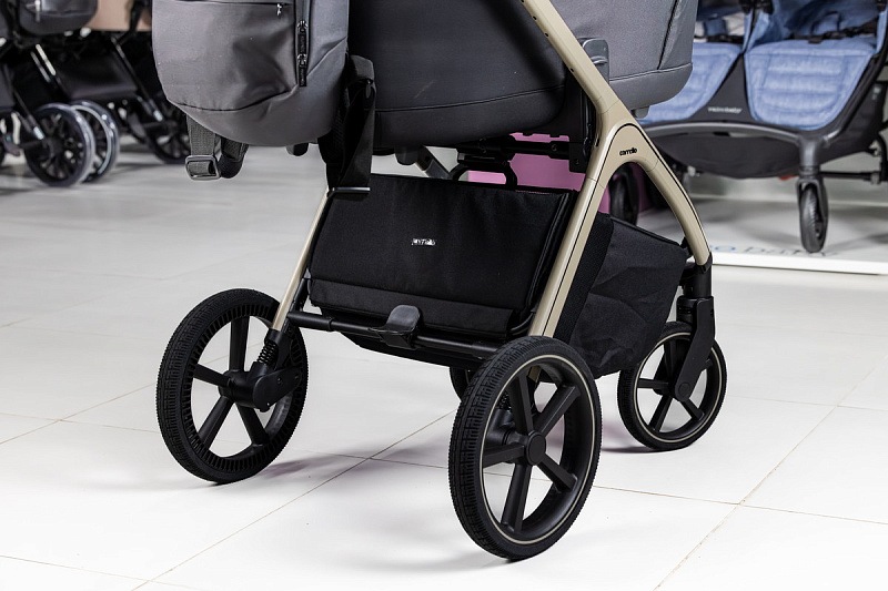 Прочная и лёгкая алюминиевая рама с телескопической регулировкой высоты родительской ручки в четырёх положениях и спаренным тормозом.Мягкая пружинная амортизация на каждом колесе.