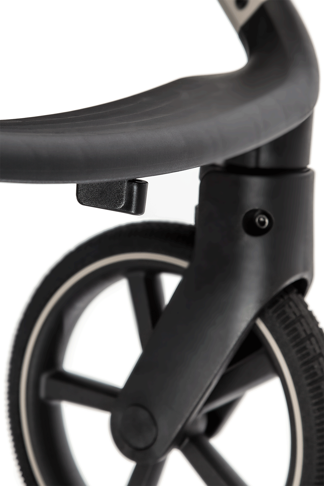 Передние колёса с автоматической стабилизацией, поворотные на 360°, фиксируются в положении «прямо» при помощи удобного переключателеля под подножкой.