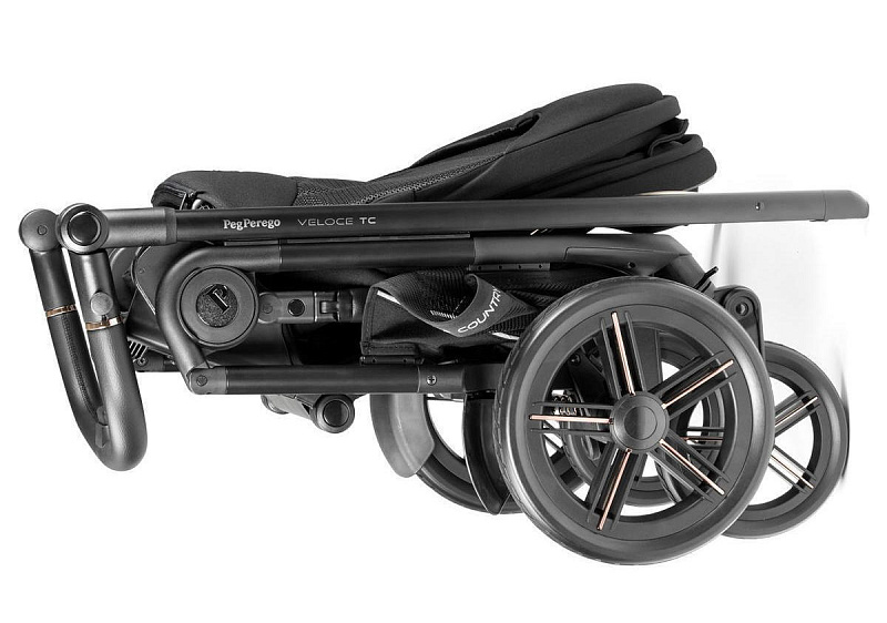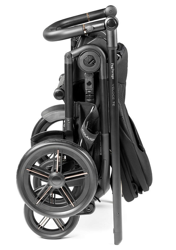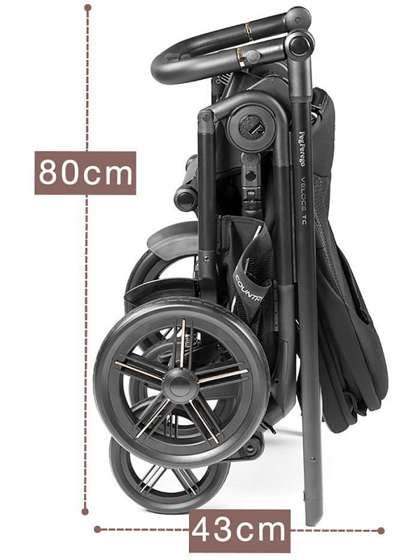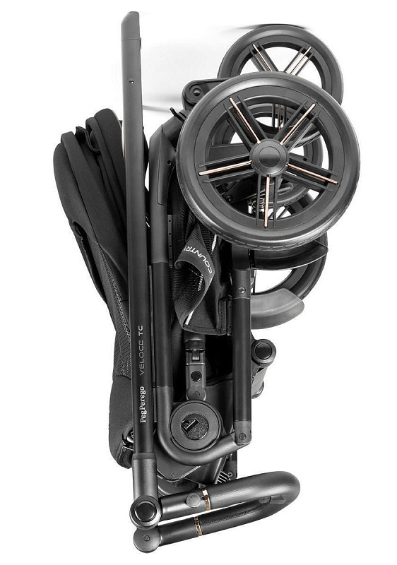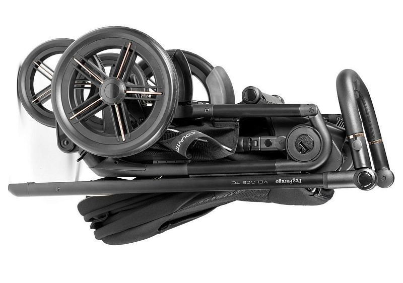 Прогулочная коляска Veloce TC складывается и раскладывается всего одной рукой с помощью специальной централизованной системы складывания, расположенной на ручке. В сложенном виде занимает очень мало места, и сама стоит без опоры, не пачкая ручку и тканевую обивку.