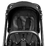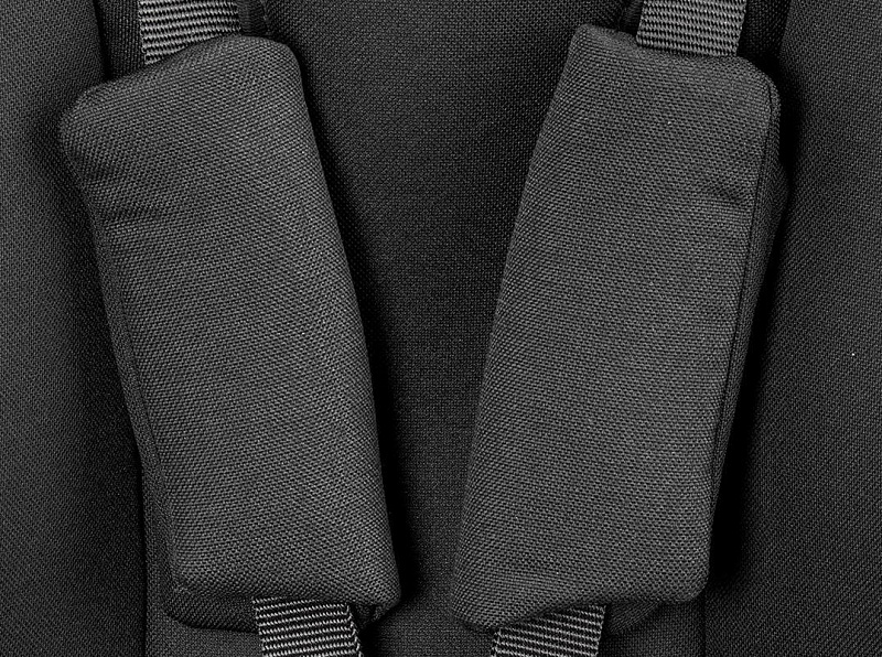 Просторное сиденье оснащено пятиточечными ремнями безопасности с мягкими накладками и системой защелкивания, расстегнуть которую могут только родители.