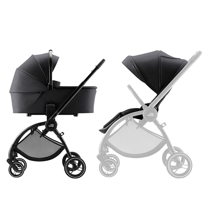 Устанавливается штатным ремнем или на поворотную базу Britax Roemer, а также совместима с большинством прогулочных колясок.