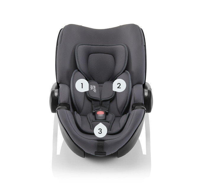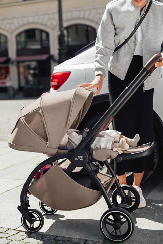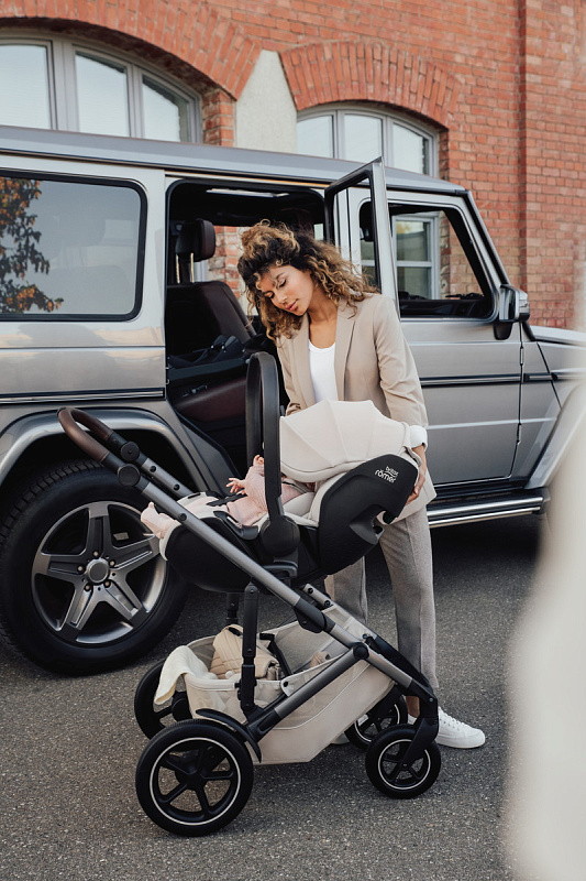 Устанавливается штатным ремнем или на поворотную базу Britax Roemer, а также совместима с большинством прогулочных колясок.