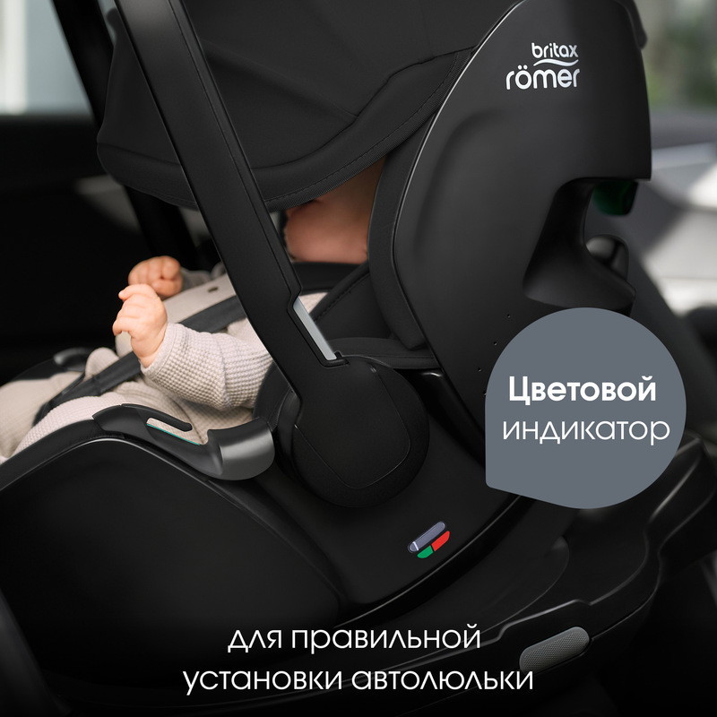 Устанавливается штатным ремнем или на поворотную базу Britax Roemer, а также совместима с большинством прогулочных колясок.