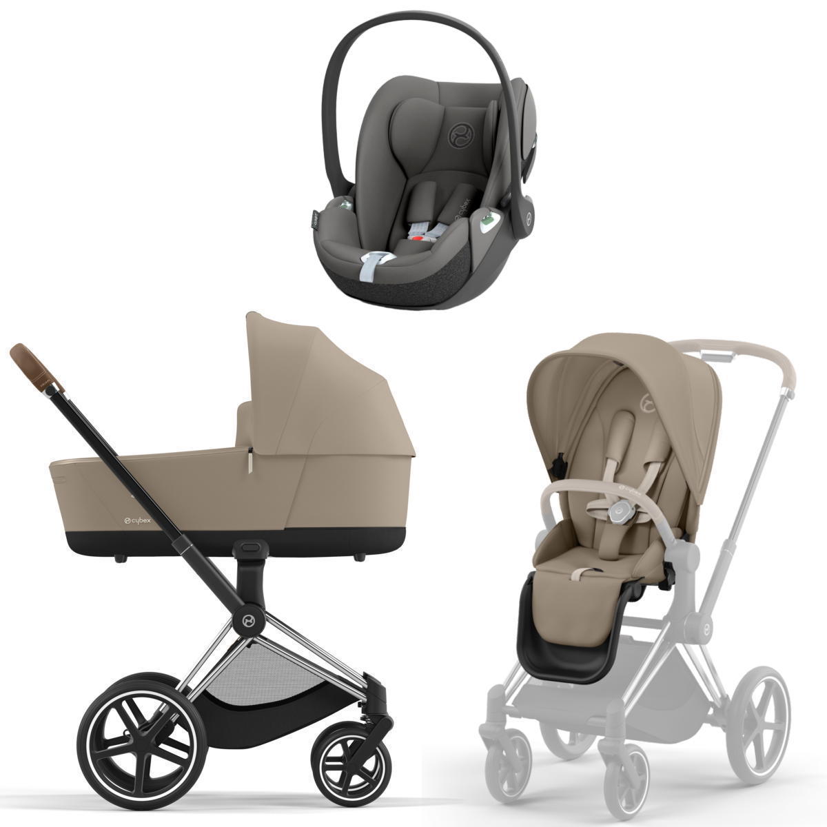 Коляска 3 в 1 Cybex Priam IV Chrome Brown complete и автокресло Cloud T i-Size Mirage Grey Cozy Beige