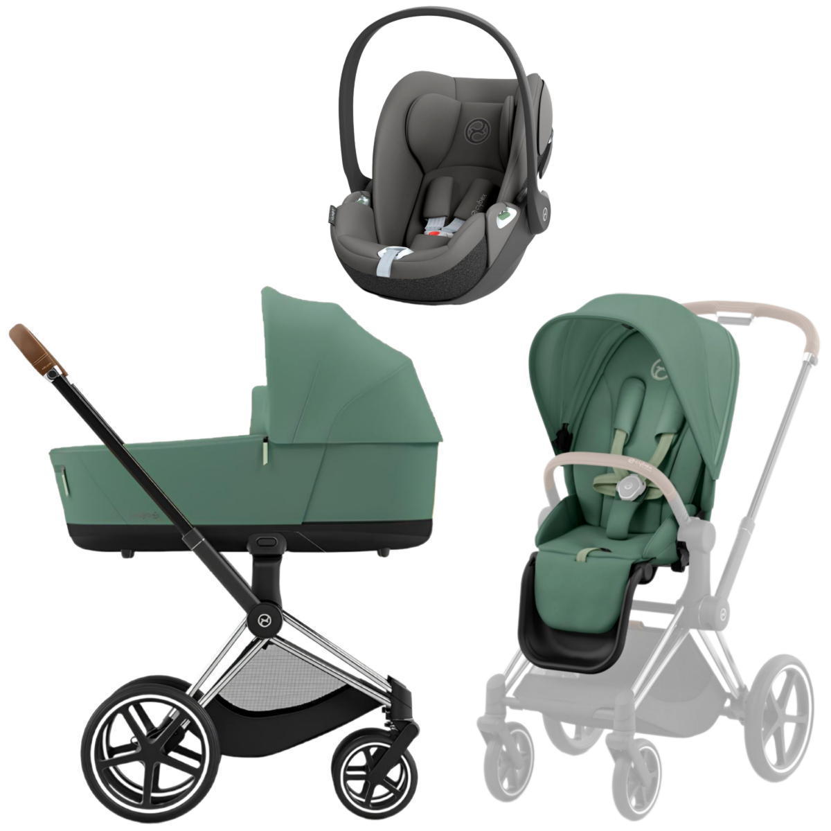 Коляска 3 в 1 Cybex Priam IV Chrome Brown complete и автокресло Cloud T i-Size Mirage Grey Leaf Green