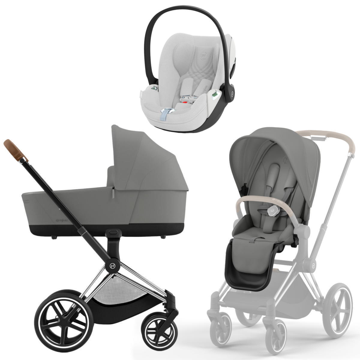 Коляска 3 в 1 Cybex Priam IV Chrome Brown complete и автокресло Cloud T i-Size Platinum White Plus Mirage Grey