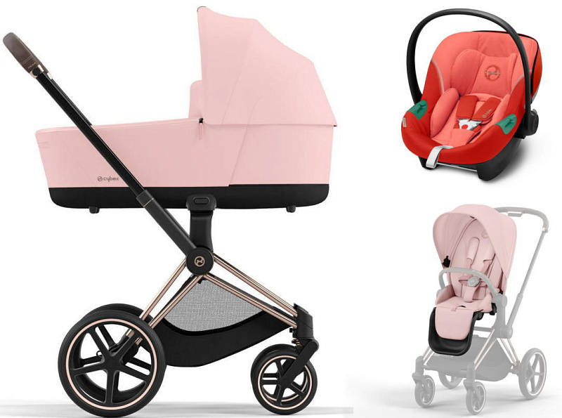 Коляска 3 в 1 Cybex Priam IV Rosegold complete и автокресло Aton S2 i-Size Hibiscus Red Peach Pink