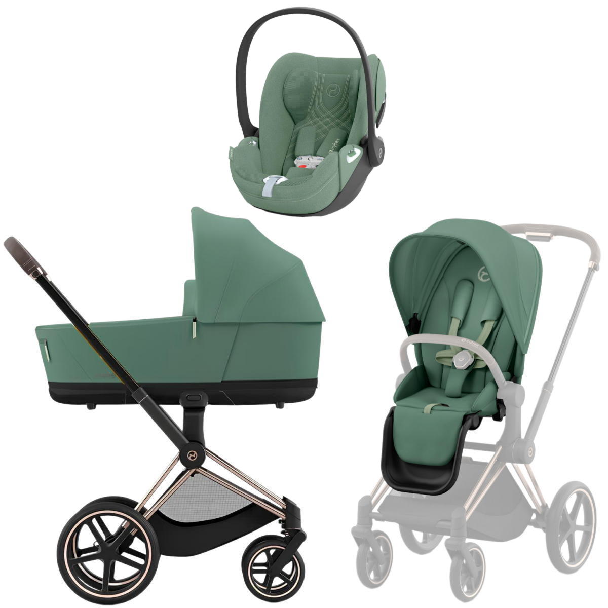 Коляска 3 в 1 Cybex Priam IV Rosegold complete и автокресло Cloud T i-Size Leaf Green Plus Leaf Green