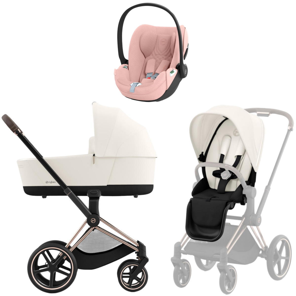Коляска 3 в 1 Cybex Priam IV Rosegold complete и автокресло Cloud T i-Size Peach Pink Plus Off White