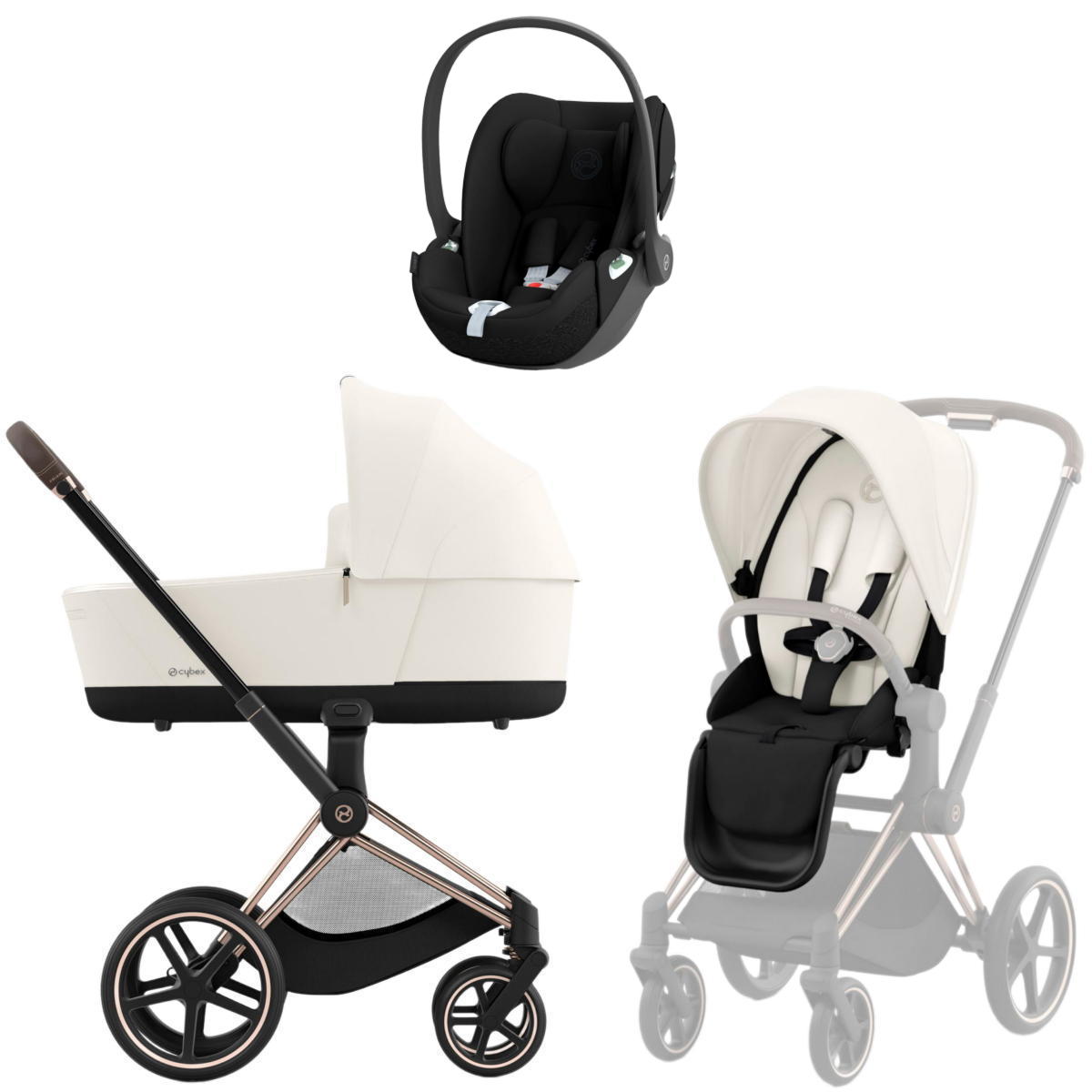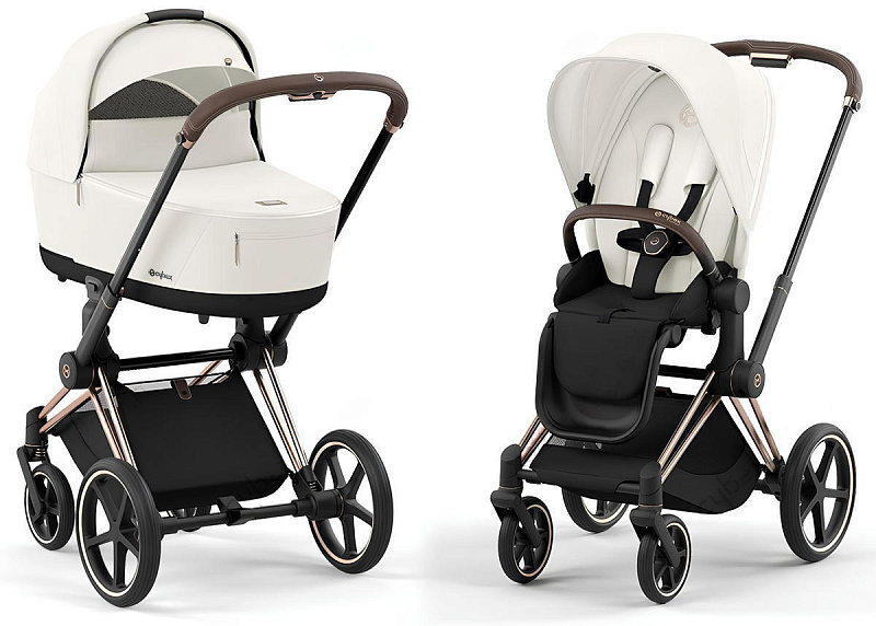 Cybex Priam IV 3 в 1 (Сайбекс Приам 4) является самым полным комплектом немецкой гибридной универсальной премиальной коляски, который удовлетворит все изысканные потребности с первых дней жизни вашего малыша до достижения им 4-летнего возраста. Данная модель коляски Priam IV имеет шасси модели в расцветке Rosegold (рама розовое золото, бампер и ручка в коричневом оттенке) и упакована в одну коробку, в комплекте к коляске идет автокресло Cloud T i-Size Sepia Black.