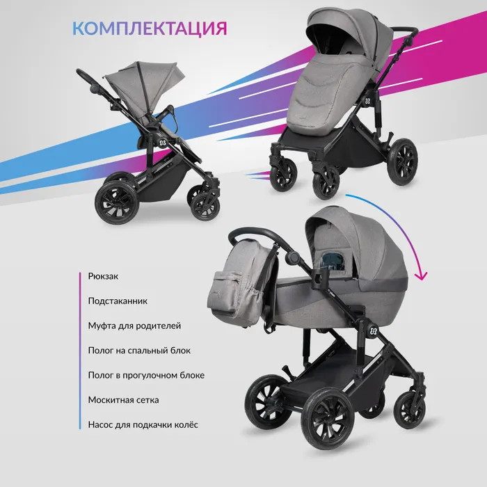 В комплекте: рюкзак, накидка на ножки в прогулочном блоке, накидка на люльку, насос для колёс, подстаканник, москитная сетка, варежки-муфты для родителей.