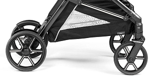 Поворотные передние колеса позволяют без труда маневрировать на городских улицах, в лифтах и торговых центрах. Открытая пружинная подвеска и шарикоподшипники обеспечивают плавных ход колес. Централизованный тормоз расположен на задней раме.