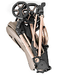 Коляска удобная для транспортировки и хранения. Шасси легко сложить одной рукой вместе с прогулочным блоком. В сложенном виде коляска компактная, сама стоит без опоры и не пачкает обивку.