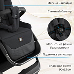 Прогулочный блок коляски имеет 3 регулируемых положения спинки и большой капюшон с дополнительной секцией и козырьком. Он защищает кроху от солнца и ветра, полностью закрывая малыша до ножек в разложенном состоянии. Магнитные пятиточечные ремни безопасности гарантируют надежную фиксацию маленького пассажира и удобно регулируются по росту. Бампер из экокожи, с паховой перемычкой, легко отстегивается с обеих сторон для удобства.