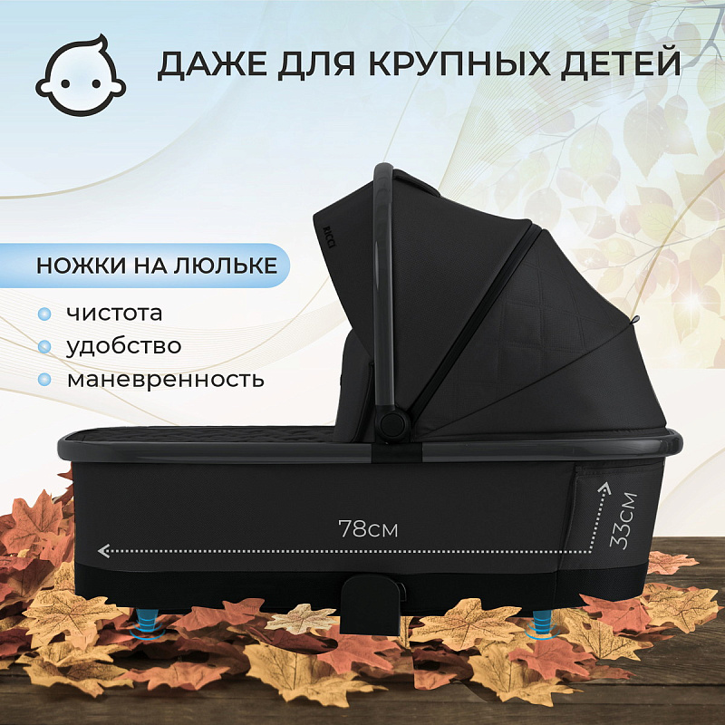 Особое внимание уделяется комфорту ребенка: просторная люлька размером 78*33 см с ножками может превращаться в удобную колыбель. Матрасик с непромокаемым чехлом и бесшумная регулировка капюшона обеспечивают дополнительный комфорт и уют во время сна. Система "memory button" позволяет легко отсоединить люльку от шасси всего в 2 клика.