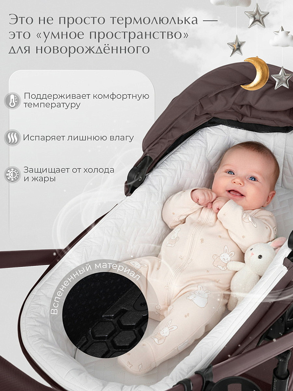 - Термолюлька нового поколения 85х43х66 см, которая обеспечивает оптимальную температуру внутри и обладает отличной теплоизоляцией - малышу комфортно в любых погодных условиях и служит барьером от внешнего мира: