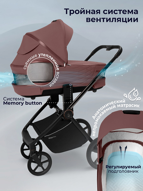 Уникальное термоактивное дно люльки поддерживает оптимальную температуру, позволяя вашему ребенку наслаждаться свежим воздухом и уютом даже в самые прохладные дни. Вентиляционные окошки для проветривания люльки оснащены утепленными вставками, которые легко отстегиваются при наступлении тепла, обеспечивая идеальный климат для вашего малыша. Обратите внимание на новые увеличенные колеса из высокомолекулярного полимера, аналогичных тем, что используются в кроссовках Nike. Эти колеса гарантируют отличную амортизацию и сцепление с различными покрытиями, что делает каждую прогулку плавной и комфортной. Даже на неровных поверхностях ваш малыш не почувствует ни малейшего дискомфорта, а родителям будет легко управлять коляской благодаря высокоэффективной амортизации как передних, так и задних колес.