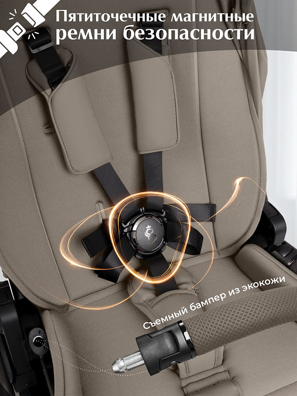 Регулируемые магнитные ремни безопасности с мягкими накладками и бампер из экокожи обеспечивают максимальную защиту и комфорт. Накидка с доступом к ребенку с молнией по центру защищает в прохладную погоду