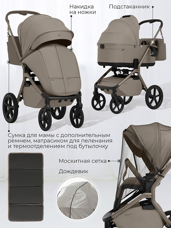 В комплекте — сумка для мамы, накидка на ножки, подстаканник, дождевик и москитная сетка, чтобы вы были готовы к любым условиям.