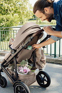 - С помощью поворотных передних колёс можно легко маневрировать во время городских прогулок, а для комфортного путешествия по пересеченной местности их можно зафиксировать. Передние колёса с амортизацией компенсируют неровности дороги, поэтому вы можете открывать мир своему малышу, гуляя с ним и по брусчатым мостовым, и по размокшим грунтовым дорогам.