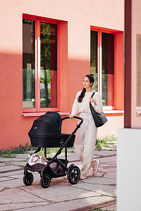 - С помощью поворотных передних колёс можно легко маневрировать во время городских прогулок, а для комфортного путешествия по пересеченной местности их можно зафиксировать. Передние колёса с амортизацией компенсируют неровности дороги, поэтому вы можете открывать мир своему малышу, гуляя с ним и по брусчатым мостовым, и по размокшим грунтовым дорогам.