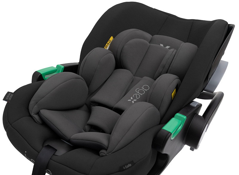 Безопасность маленького пассажира обеспечивают поворотный откидной бампер и пятиточечные ремни с мягкими накладками. Ремни регулируются по высоте в соответствии с ростом ребёнка, а бампер выполнен из качественной экокожи. Верхние ремни можно отстегнуть, но полностью убирать их нельзя — они пришиты к спинке сиденья.