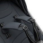 Безопасность маленького пассажира обеспечивают поворотный откидной бампер и пятиточечные ремни с мягкими накладками. Ремни регулируются по высоте в соответствии с ростом ребёнка, а бампер выполнен из качественной экокожи. Верхние ремни можно отстегнуть, но полностью убирать их нельзя — они пришиты к спинке сиденья.