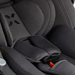 Безопасность маленького пассажира обеспечивают поворотный откидной бампер и пятиточечные ремни с мягкими накладками. Ремни регулируются по высоте в соответствии с ростом ребёнка, а бампер выполнен из качественной экокожи. Верхние ремни можно отстегнуть, но полностью убирать их нельзя — они пришиты к спинке сиденья.