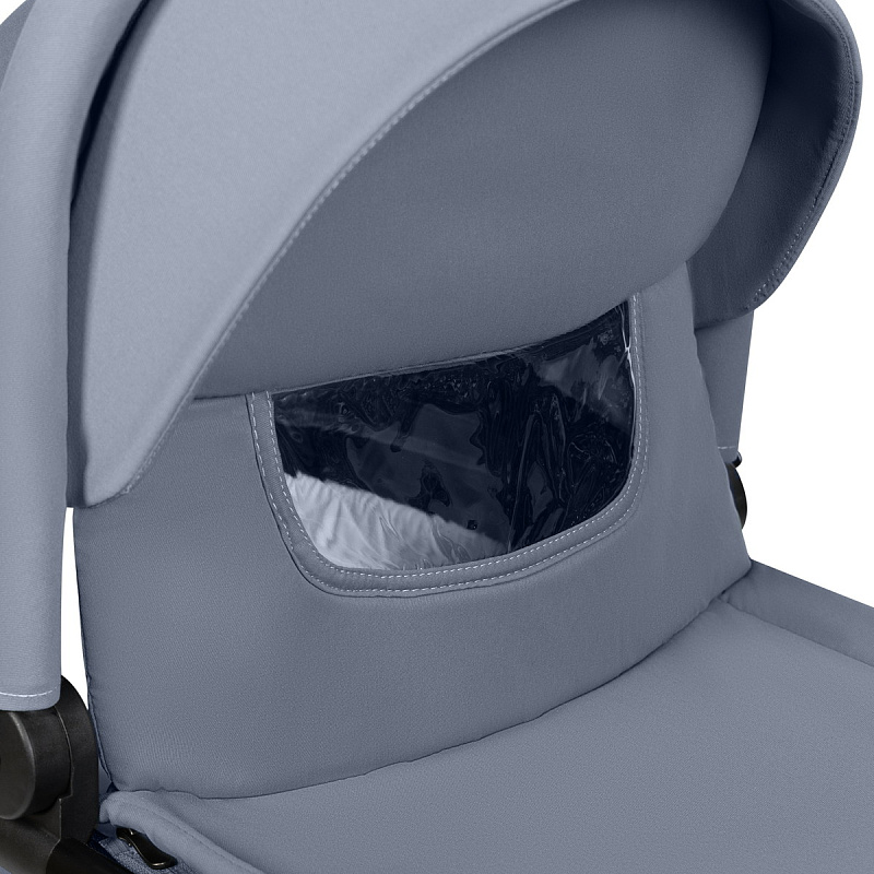 Особенность прогулочного блока коляски Agex Play — большой капюшон, который закрывает малыша до ног в сидячем положении. Ребёнок защищён от дождя и ветра. Чтобы полностью закрыть малыша, нужно максимально раскрыть капюшон. Для удобства наблюдения за малышом предусмотрено смотровое окно со шторкой на магнитах.