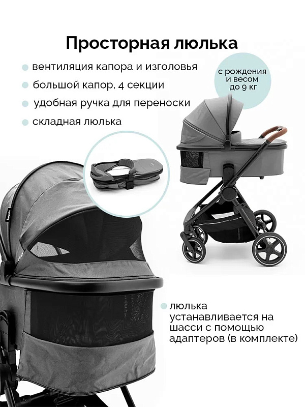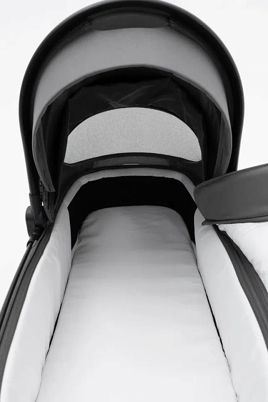 Просторная люлька с мягким матрасиком создаст у новорождённого ощущение нахождения у мамы на руках. Для защиты от солнца и ветра капюшон можно расширить, а для дополнительной циркуляции воздуха предусмотрена вентиляция капора и изголовья. Люлька компактно складывается, что облегчает хранение и транспортировку.