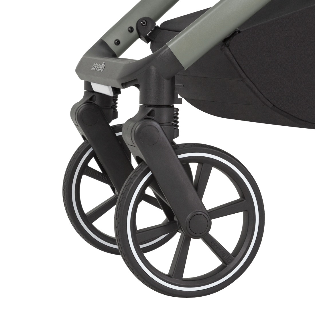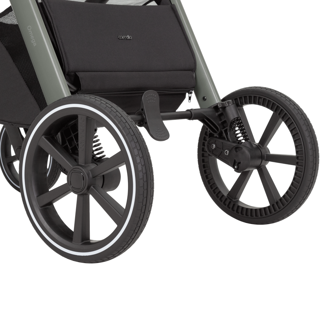 Передние колёса с автоматической фиксацией в положении «прямо», поворотные на 360°. Все колёса быстросъемные.