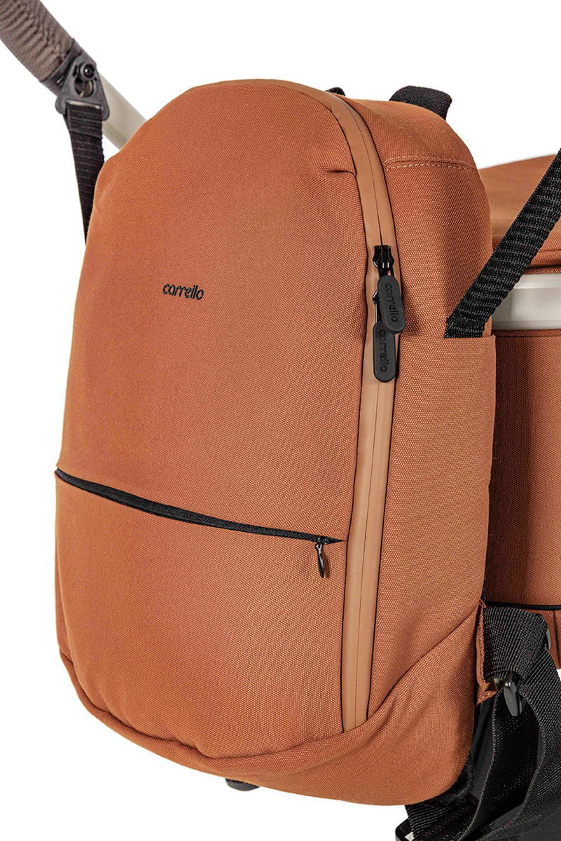 Кап прогулочного блока изменяет свою высоту, фиксируется в одном из трёх положений (разница между минимальной и максимальной высотой капа – 6 см). Кнопка-фиксатор расположена на внешней стороне спинки. Спинка выполнена из прочного гипоаллергенного пластика, с функцией проветривания. Кап оборудован дополнительной секцией под молнией, позволяющей увеличить его размер, смотровым окошком и съёмным козырьком.