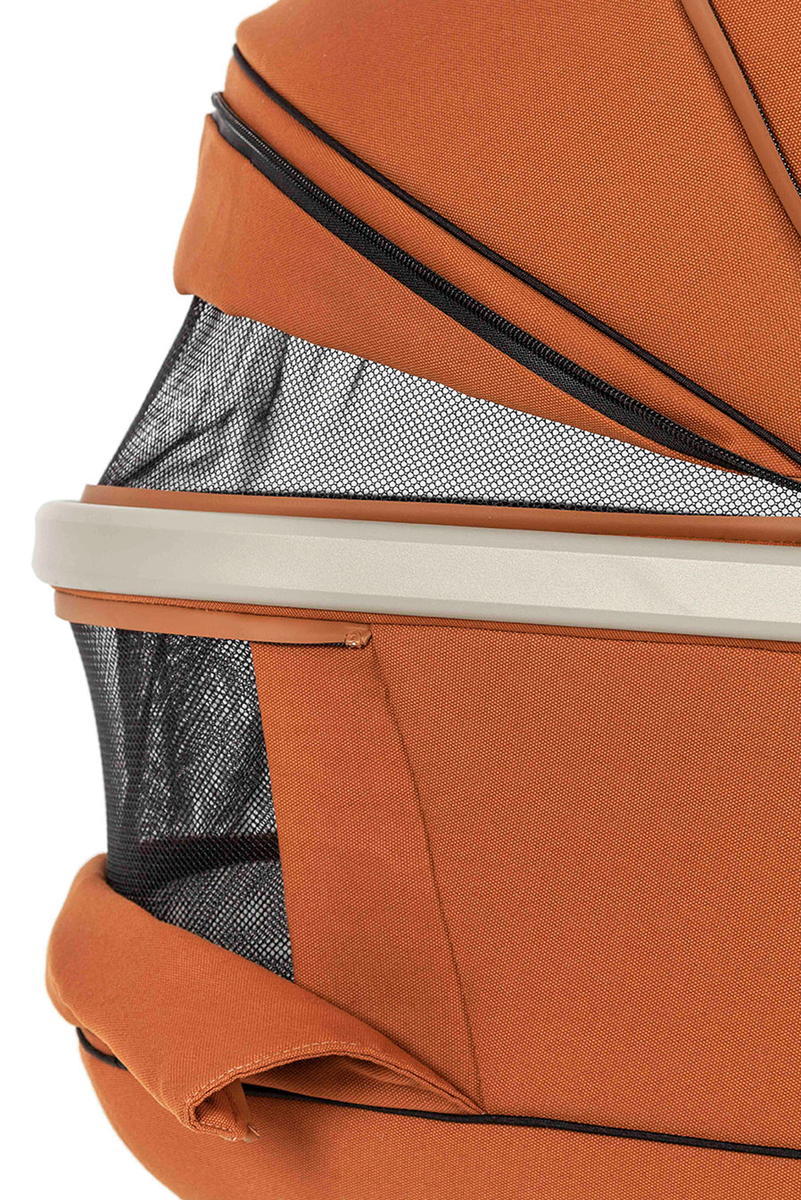 Корпус люльки изготовлен из плотного многослойного текстиля, обладает водоотталкивающим эффектом и защитой от ультрафиолетовых лучей spf 50.