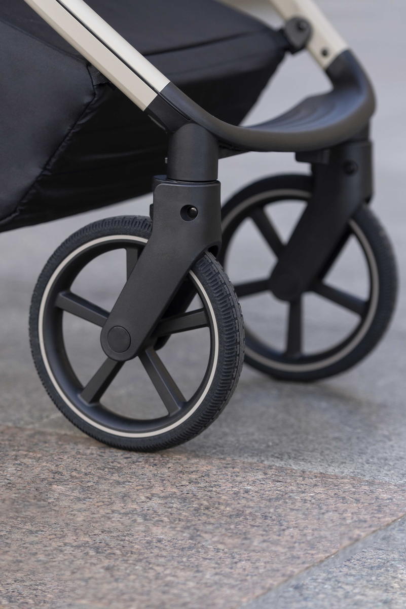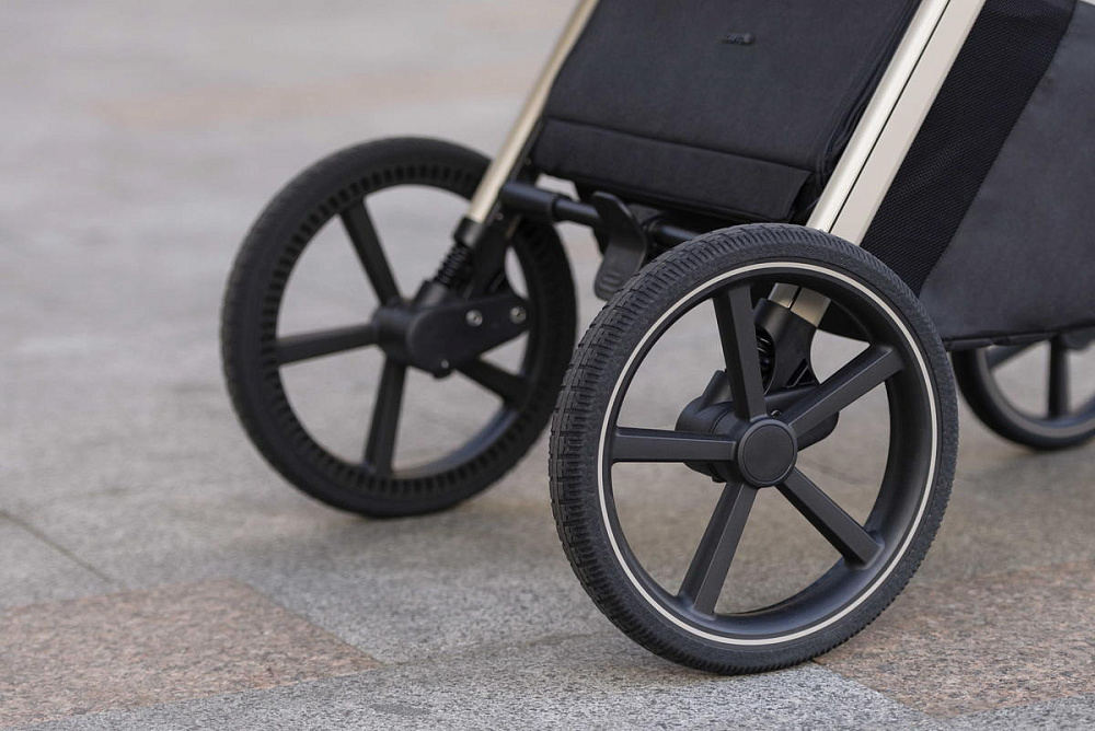 Передние колёса с автоматической стабилизацией, поворотные на 360°, фиксируются в положении «прямо» при помощи удобного переключателеля под подножкой.
