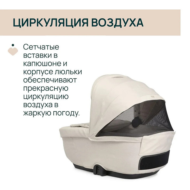 Правильная циркуляция воздуха в жаркие дни обеспечивается благодаря сетчатым вставкам на капюшоне и основании люльки. В холодные дни малыш надежно защищен благодаря съемному ветровому клапану на чехле.