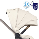 Капюшон люльки увеличивается в размере и имеет защиту от ультрафиолетовых лучей UV50+ и водоотталкивающее покрытие. Встроенный солнцезащитный козырек обеспечивает защиту ребенка от солнечных лучей и укусов комаров.