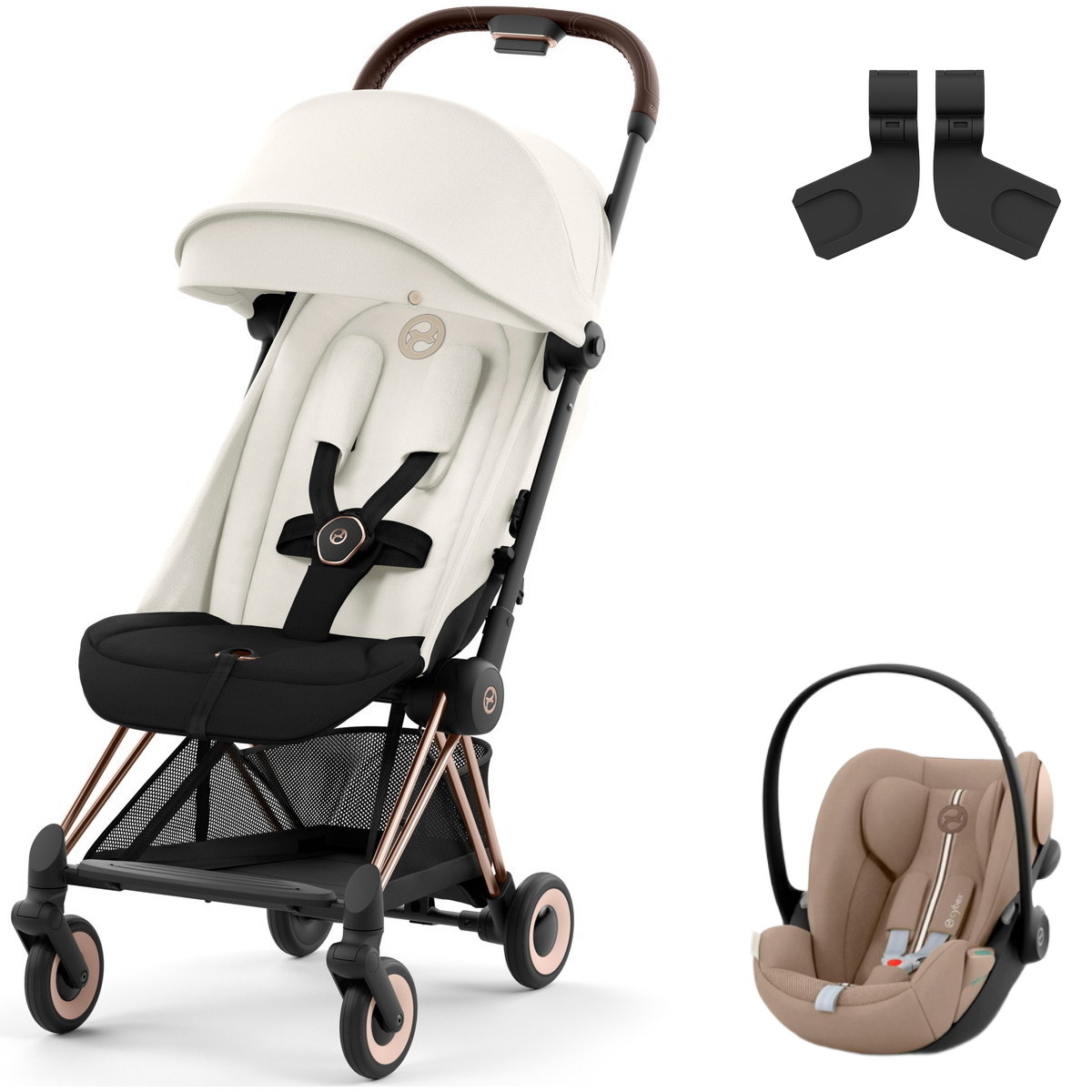 Коляска Cybex Coya Rosegold Frame Cloud G i-Size Almond Beige Plus Off White с дождевиком и бампером