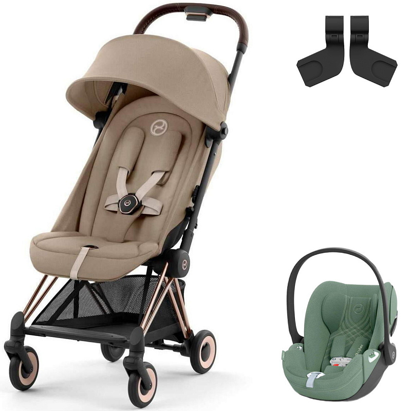Коляска Cybex Coya Rosegold Frame Cloud T i-Size Leaf Green Plus 2 в 1 Cozy Beige с дождевиком и бампером