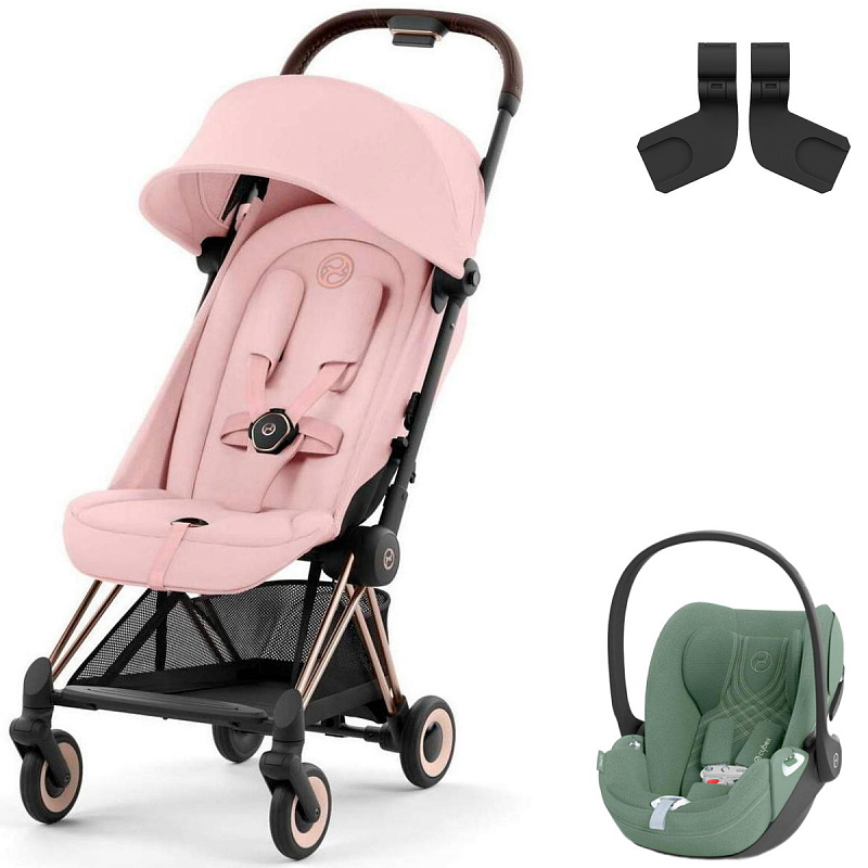 Коляска Cybex Coya Rosegold Frame Cloud T i-Size Leaf Green Plus Peach Pink с дождевиком и бампером