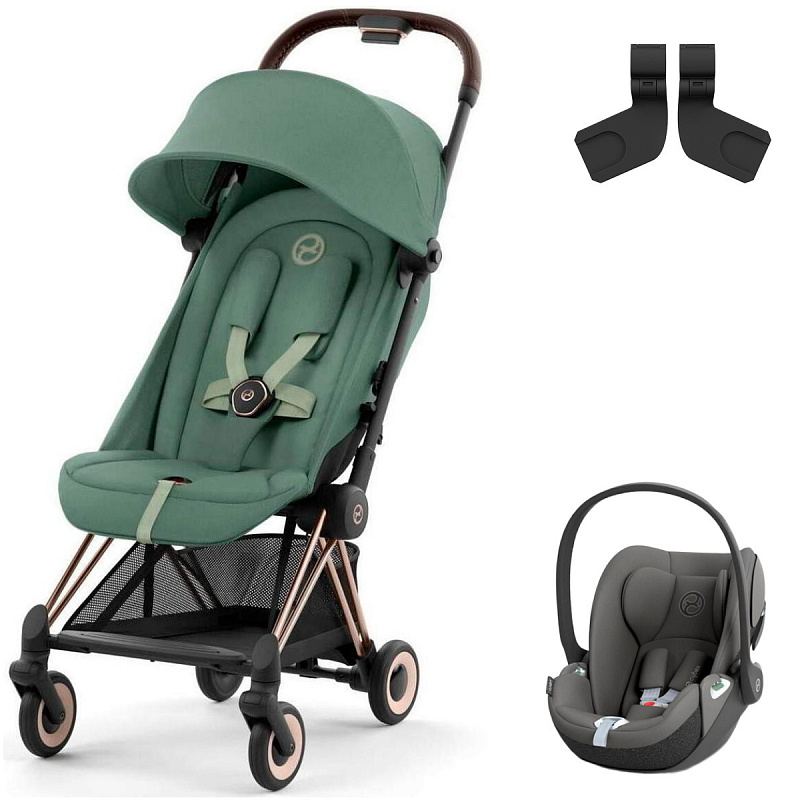 Коляска Cybex Coya Rosegold Frame Cloud T i-Size Mirage Grey 2 в 1 Leaf Green с дождевиком и бампером