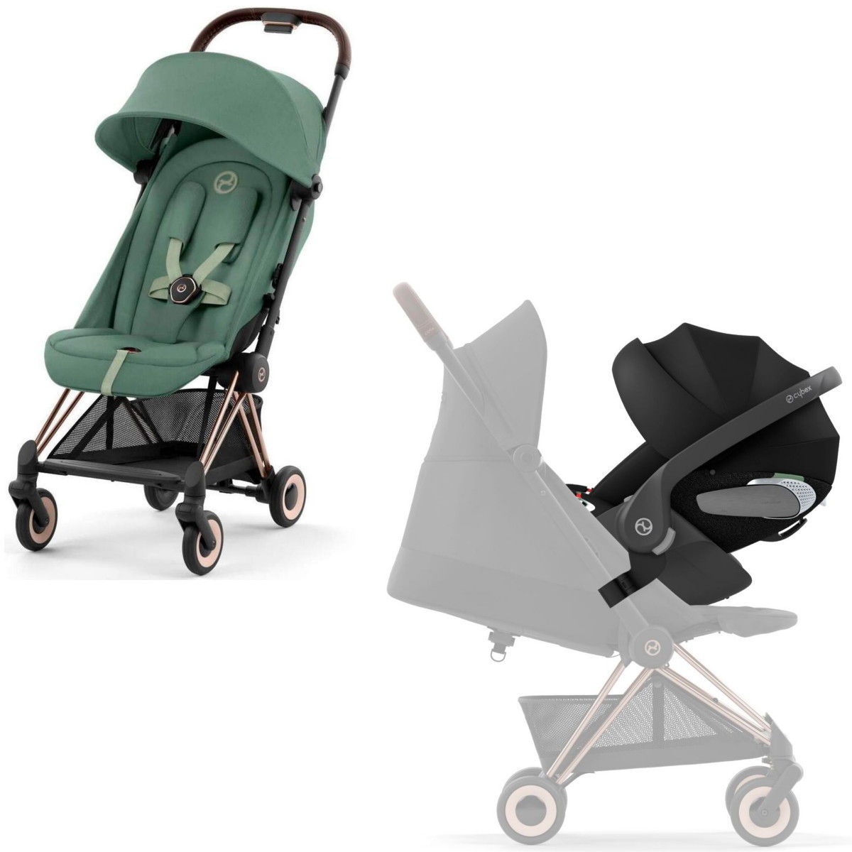 Коляска Cybex Coya Rosegold Frame Cloud T i-Size Sepia Black Leaf Green с дождевиком и бампером