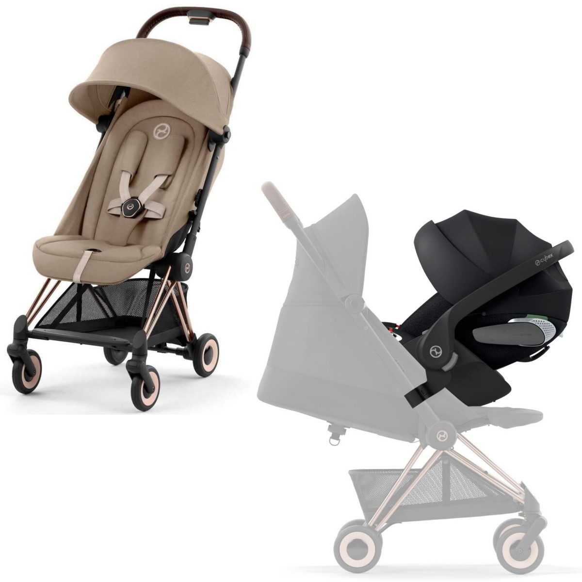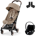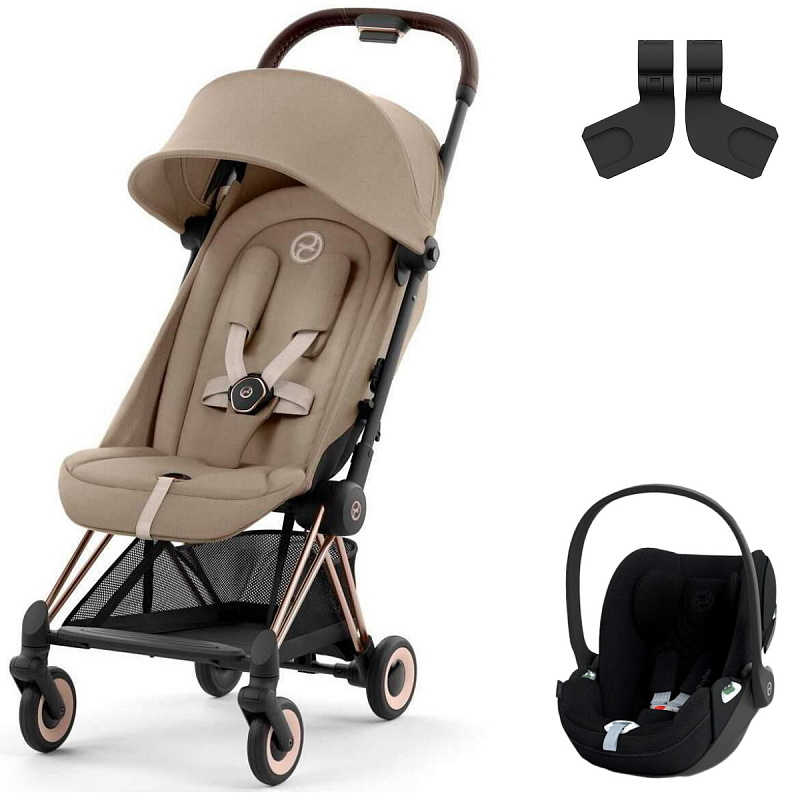 Коляска Cybex Coya Rosegold Frame Cloud T i-Size Sepia Black Plus Cozy Beige с дождевиком и бампером