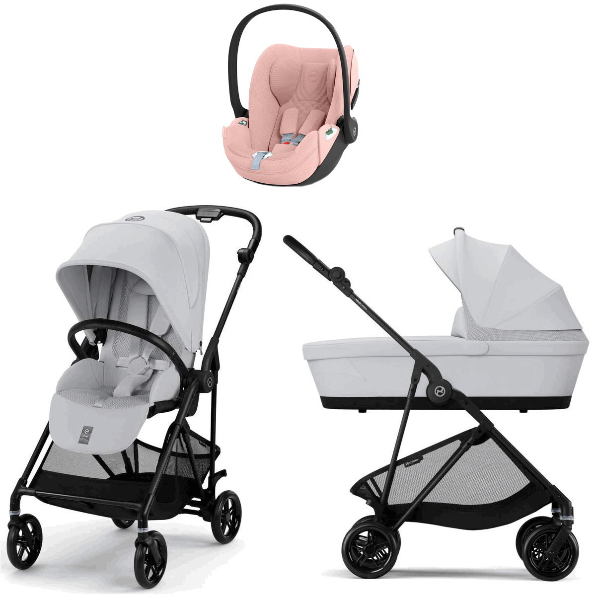 Коляска Cybex Melio Carbon Cloud T i-Size Peach Pink Plus 3 в 1 Fog Grey с дождевиком